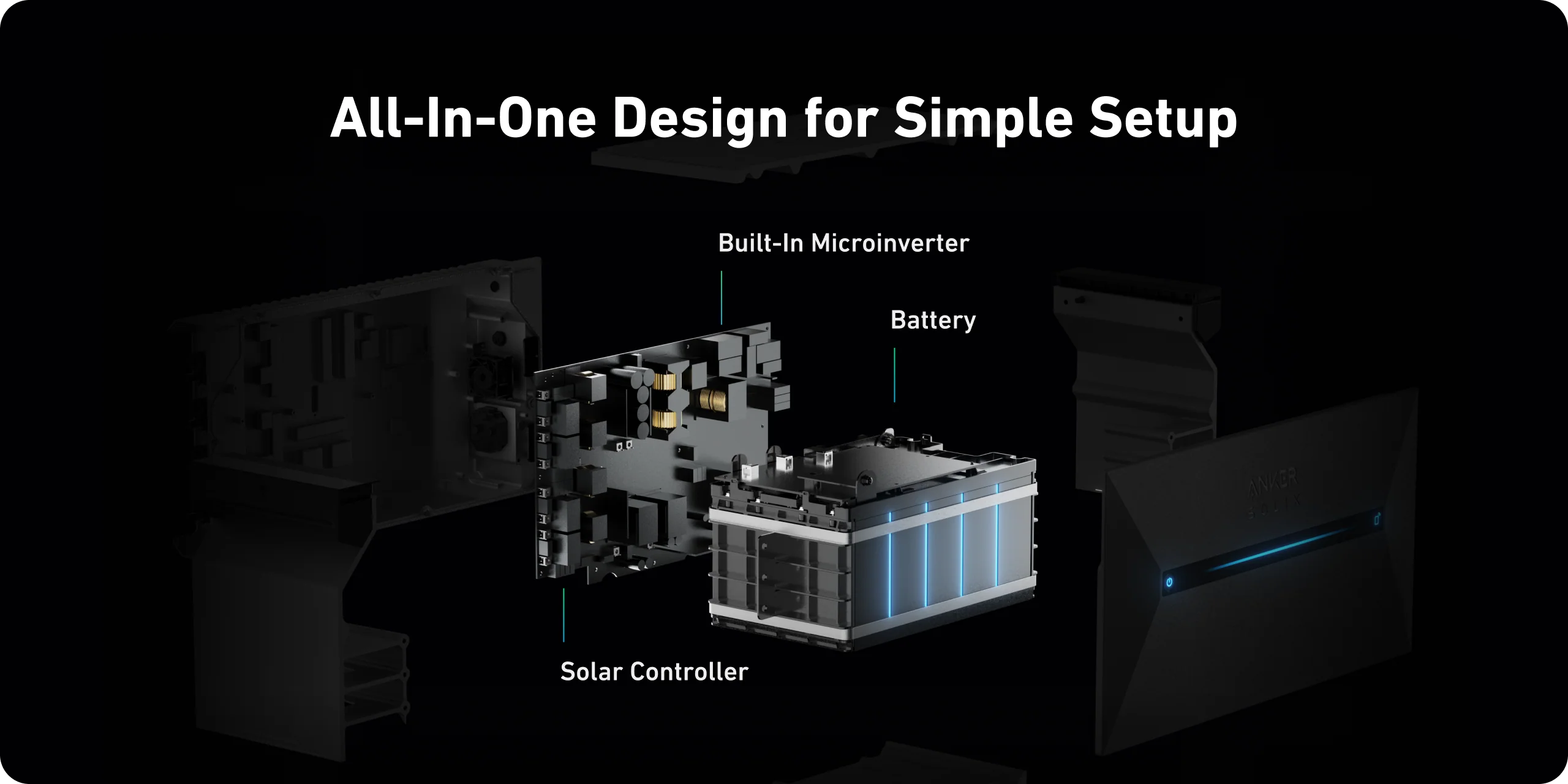 - All-in-one design combining battery, micro inverter and controller in a single device